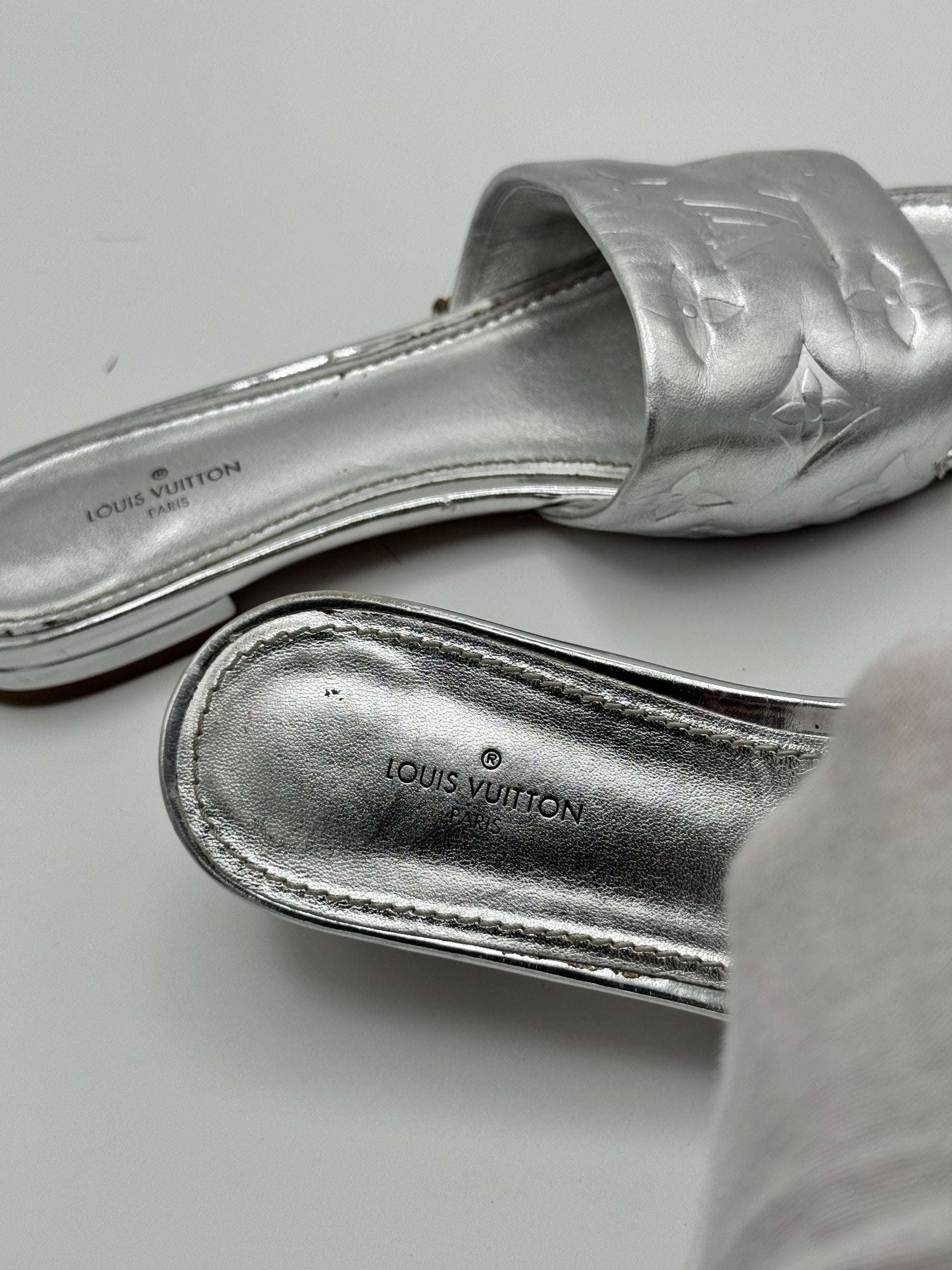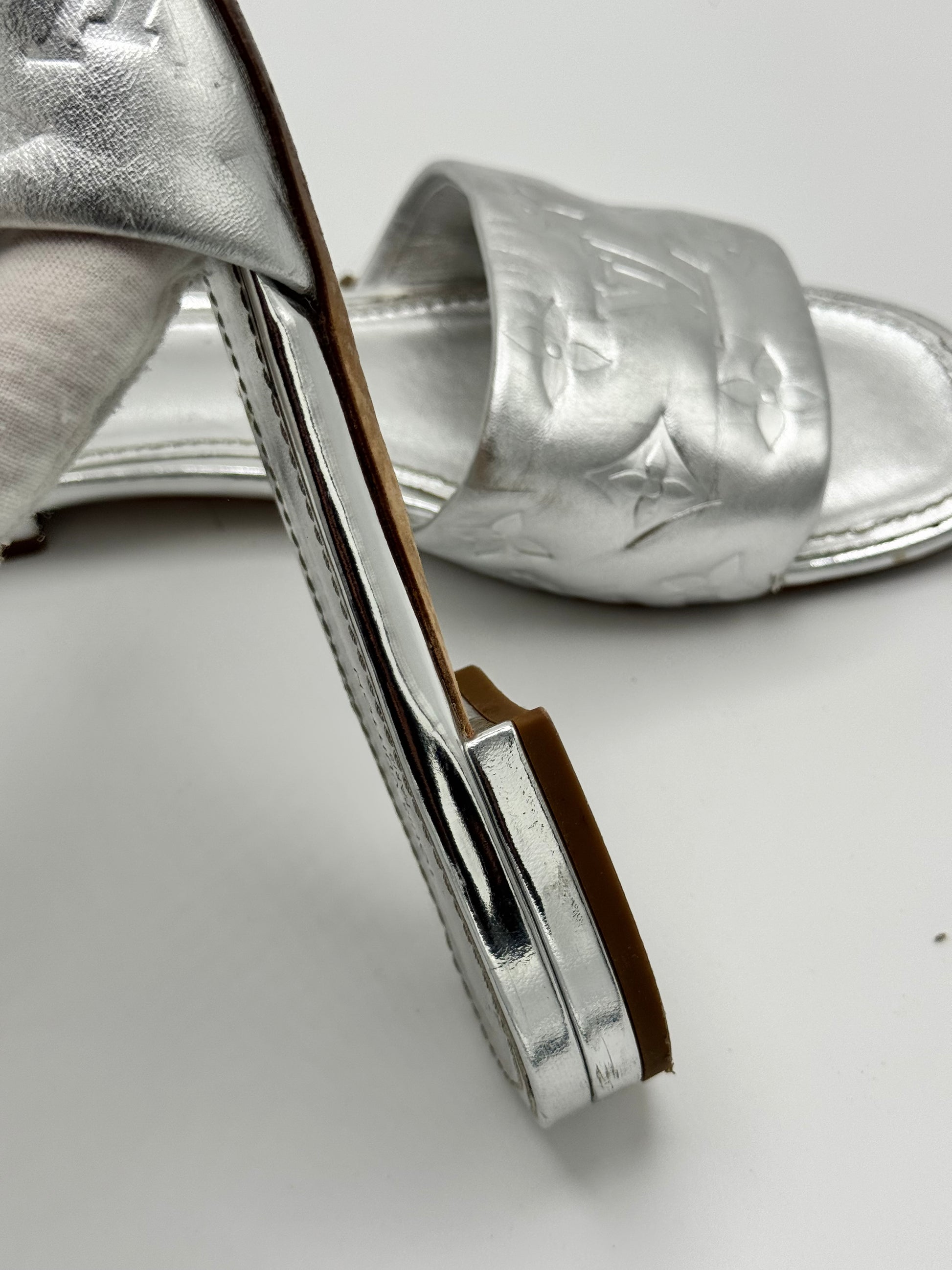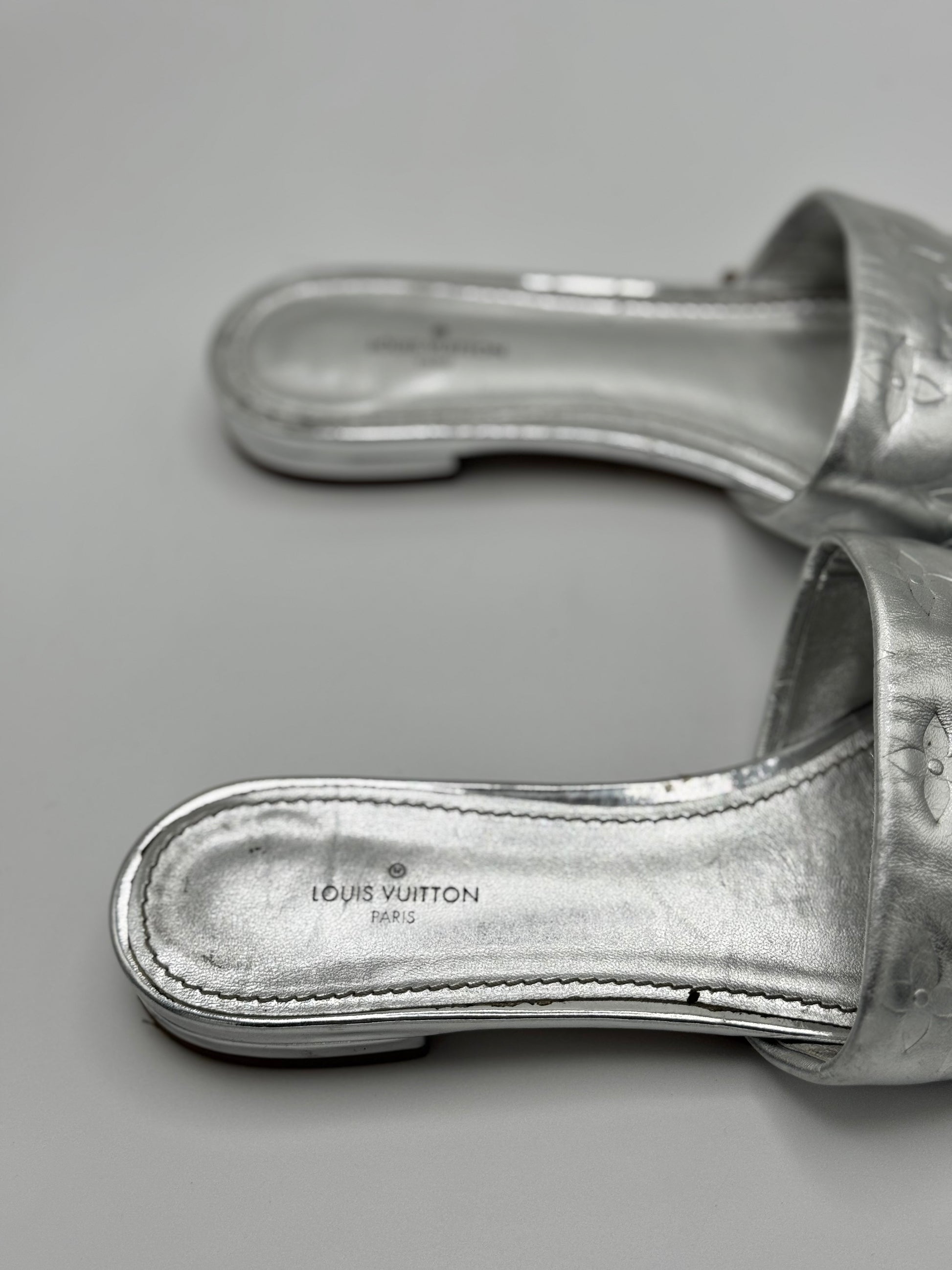 Louis Vuitton Silver Monogram Embossed Leather Revival Flat Slides 37.5