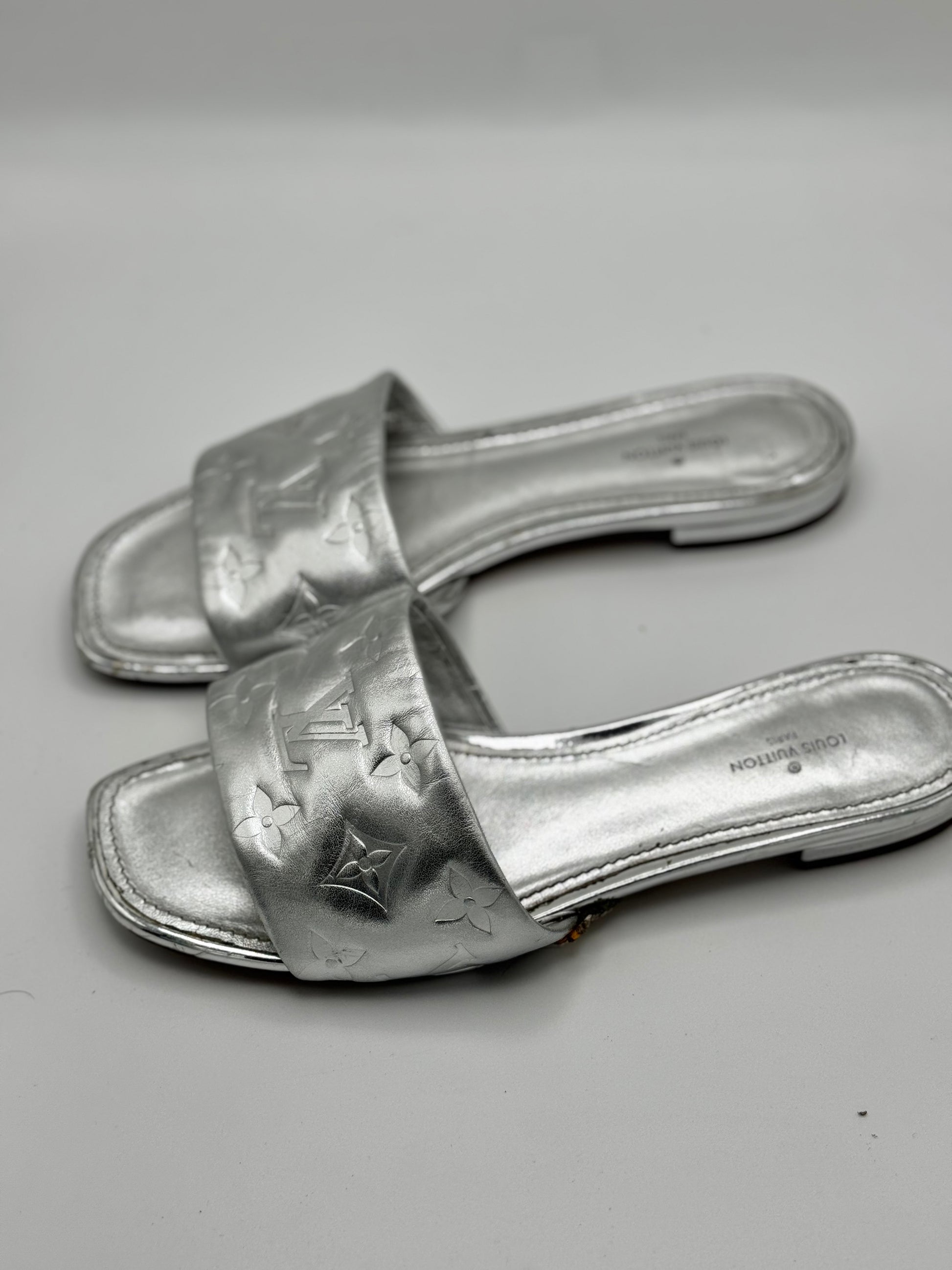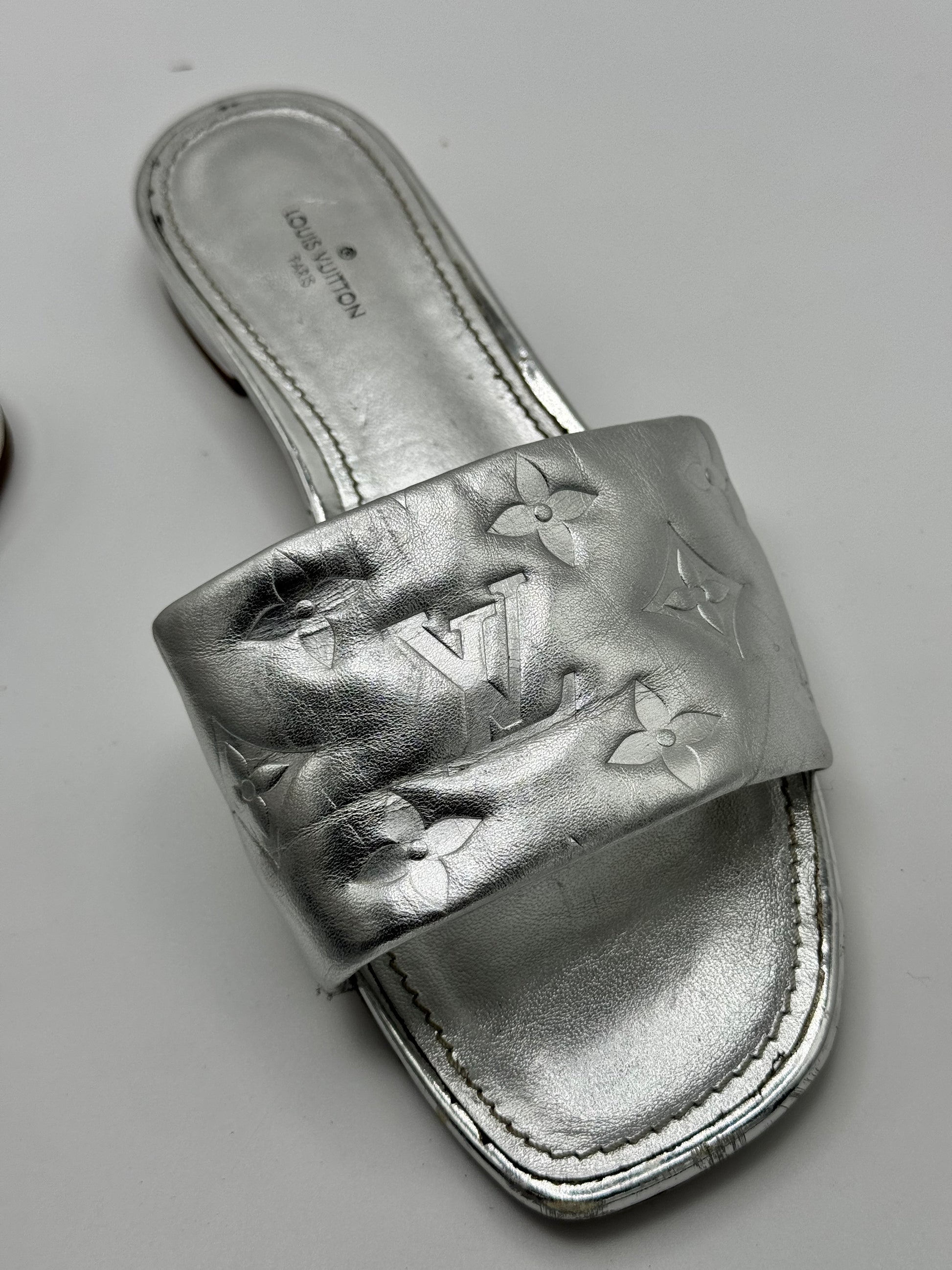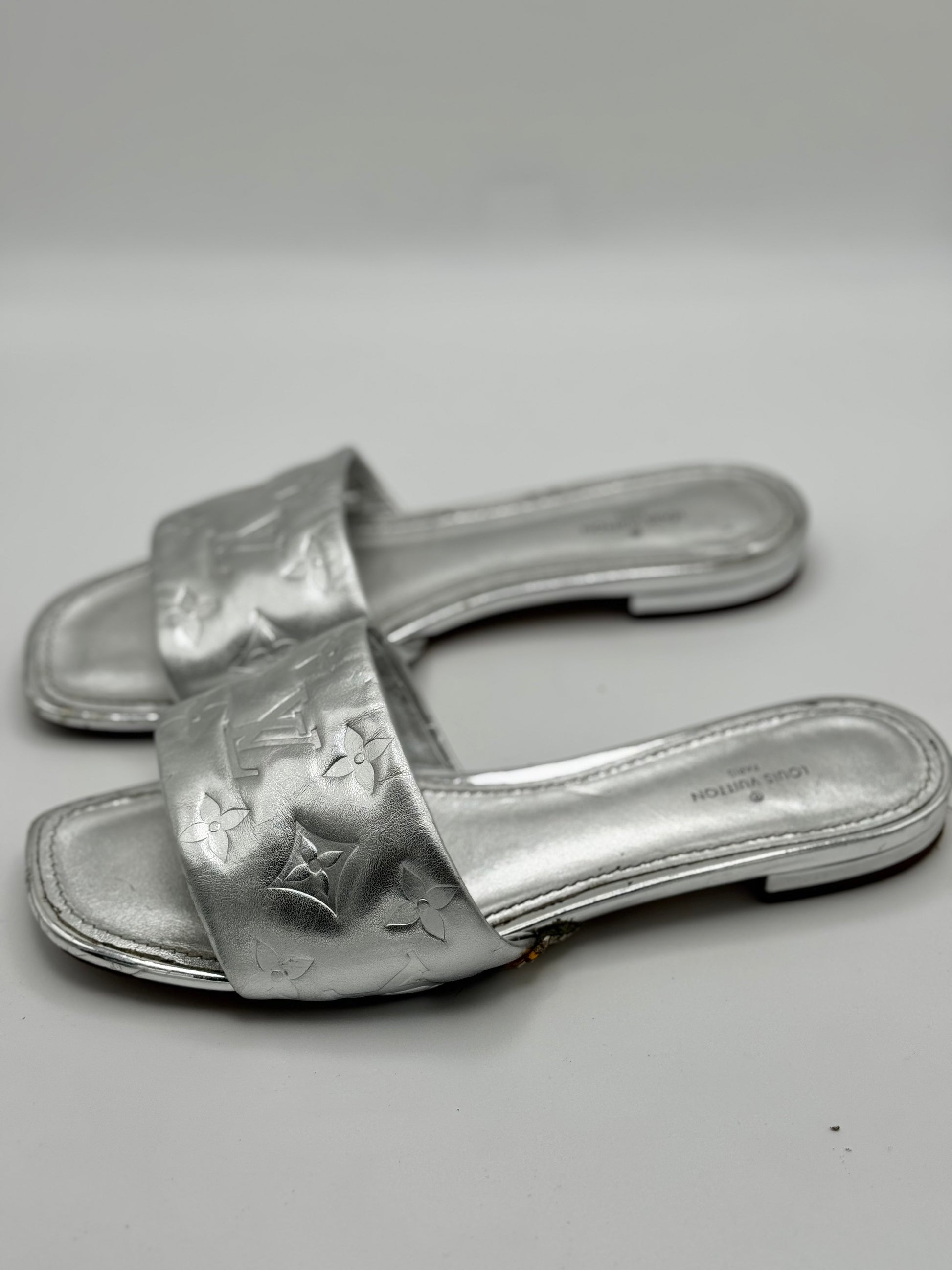 Louis Vuitton Silver Monogram Embossed Leather Revival Flat Slides 37.5